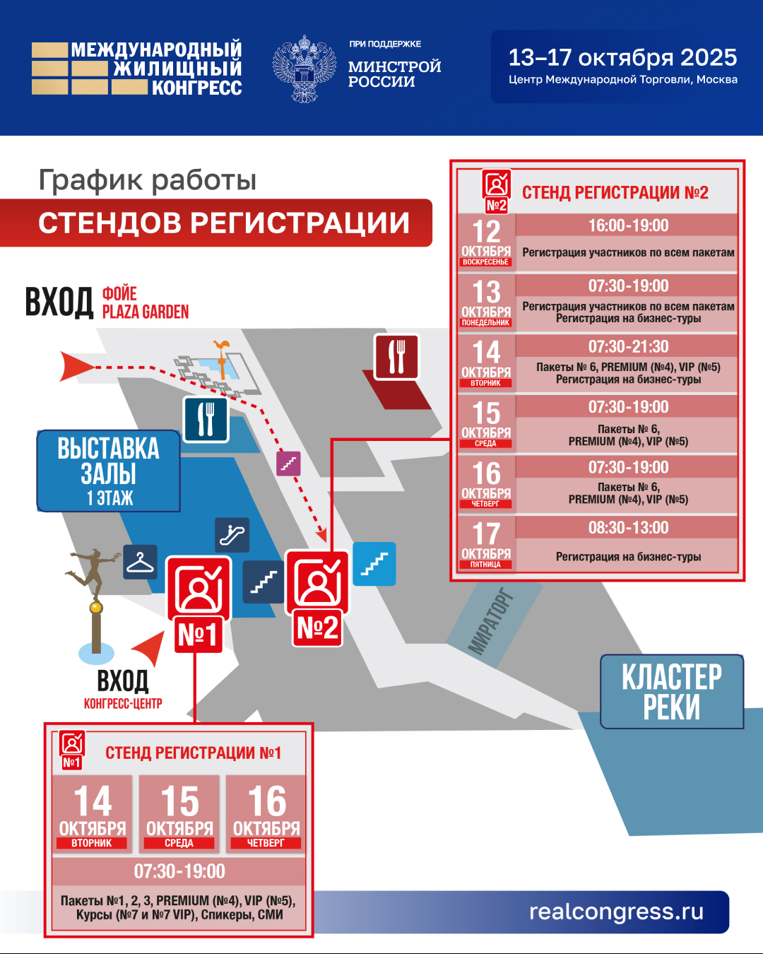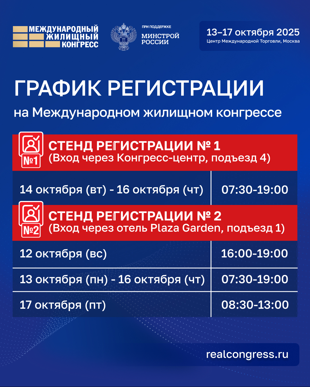 🔔 Если вы не успели зарегистрироваться на Международный жилищный конгресс, можно сделать это на стенде регистрации, который будет работать с 12 октября (воскресенье).
